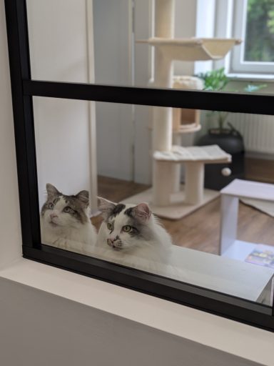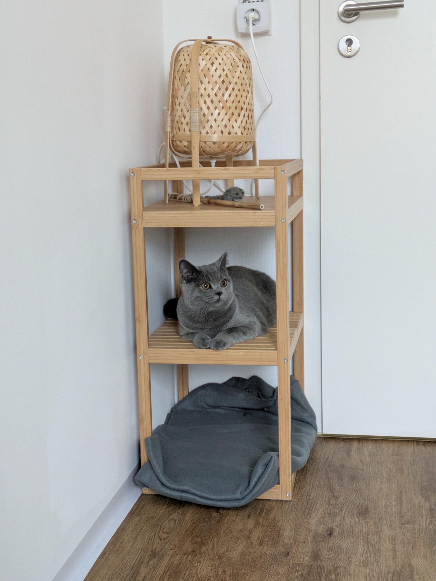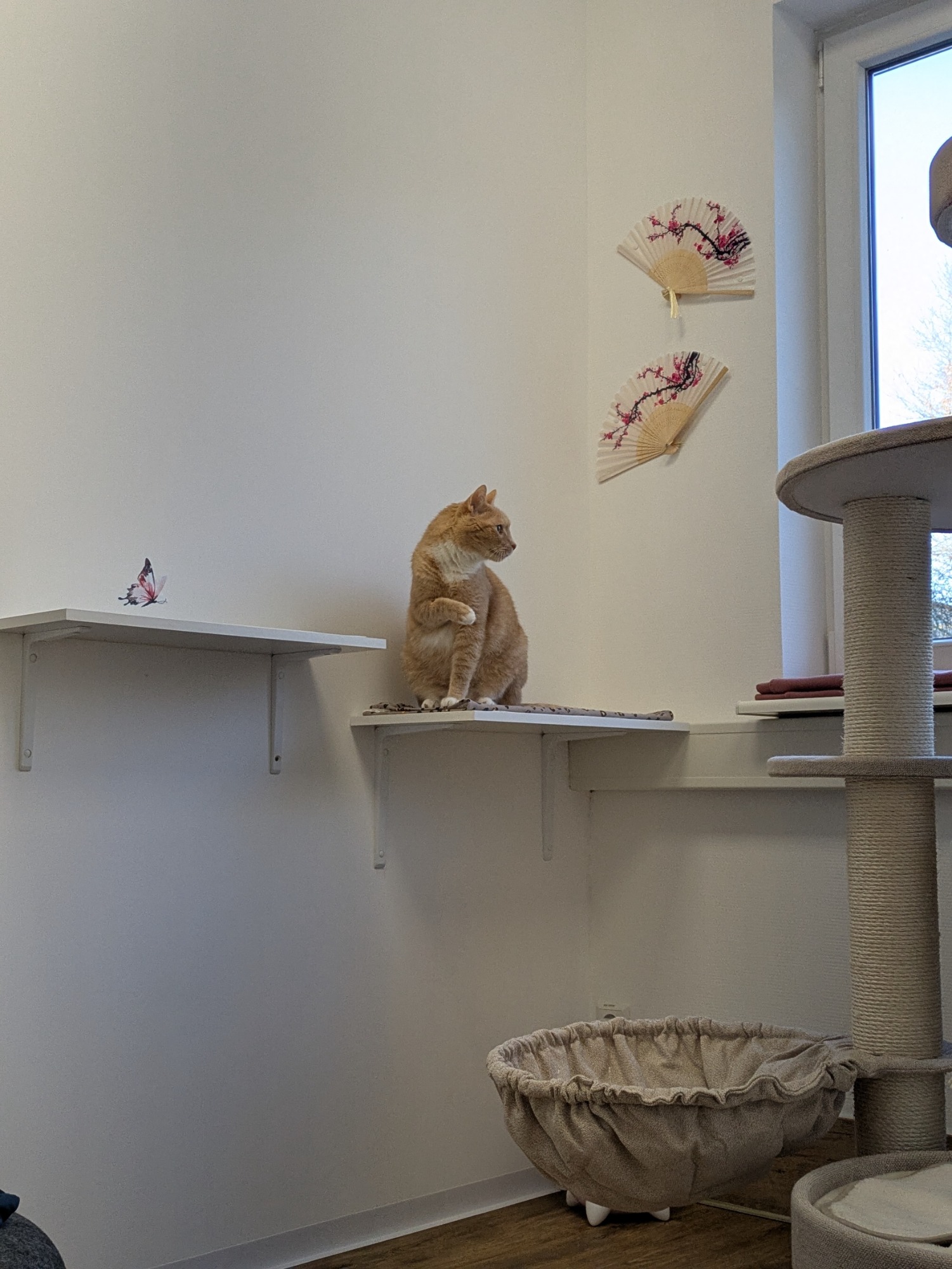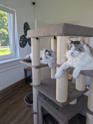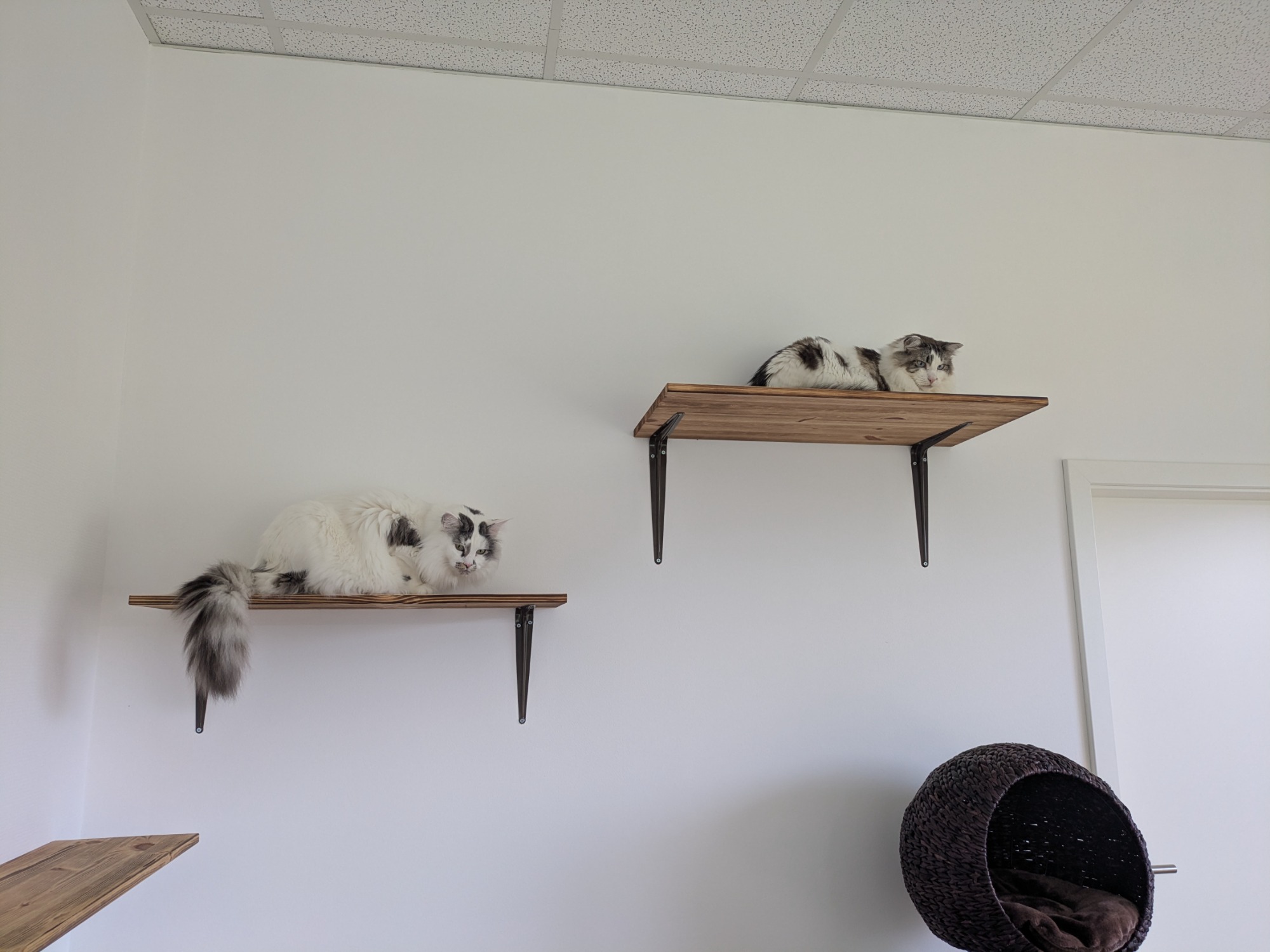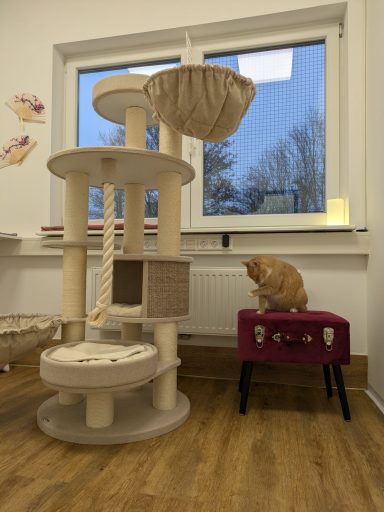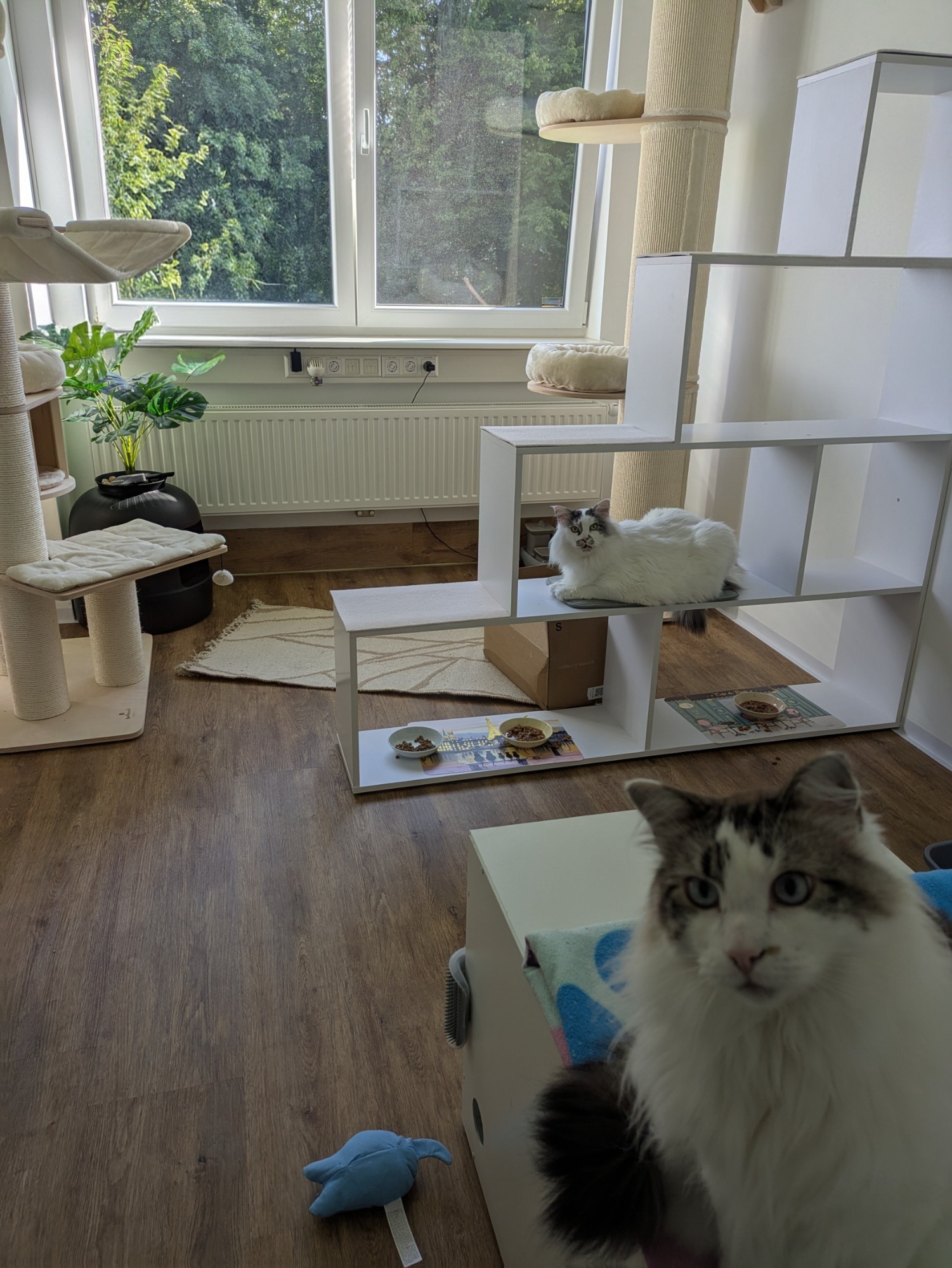 Ausstattung: Doppeltes Tageslichtfenster, zwei Kratzbäume mit unterschiedlichen Ebenen sowie Liege- und Versteckmöglichkeiten, Stufenregal zum erhöhten Liegeplatz, mehrere Katzentoiletten, Wahl zwischen Trinknapf oder Wasserbrunnen, diverse Spielzeuge