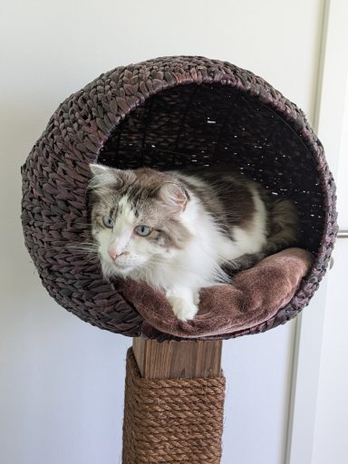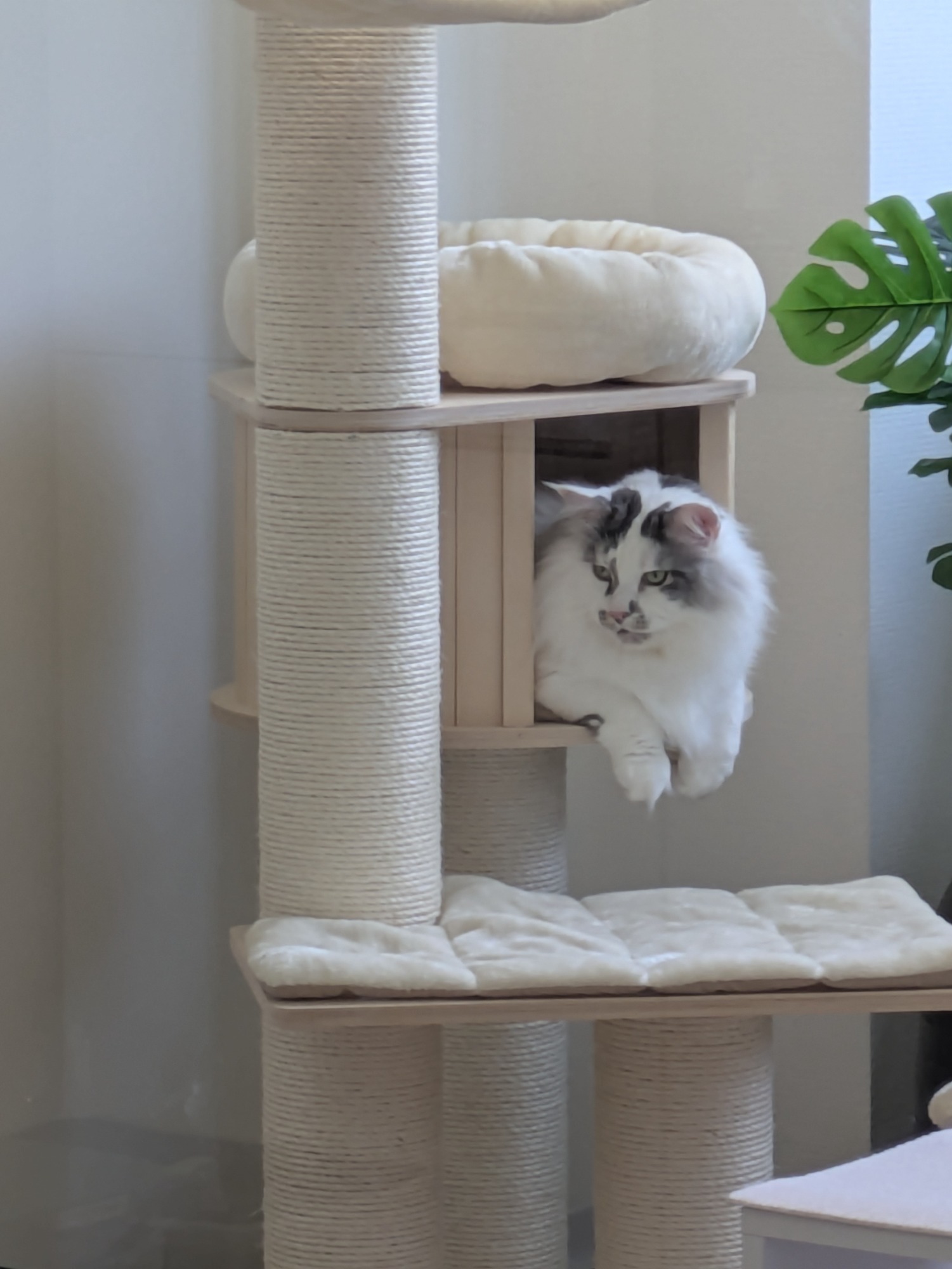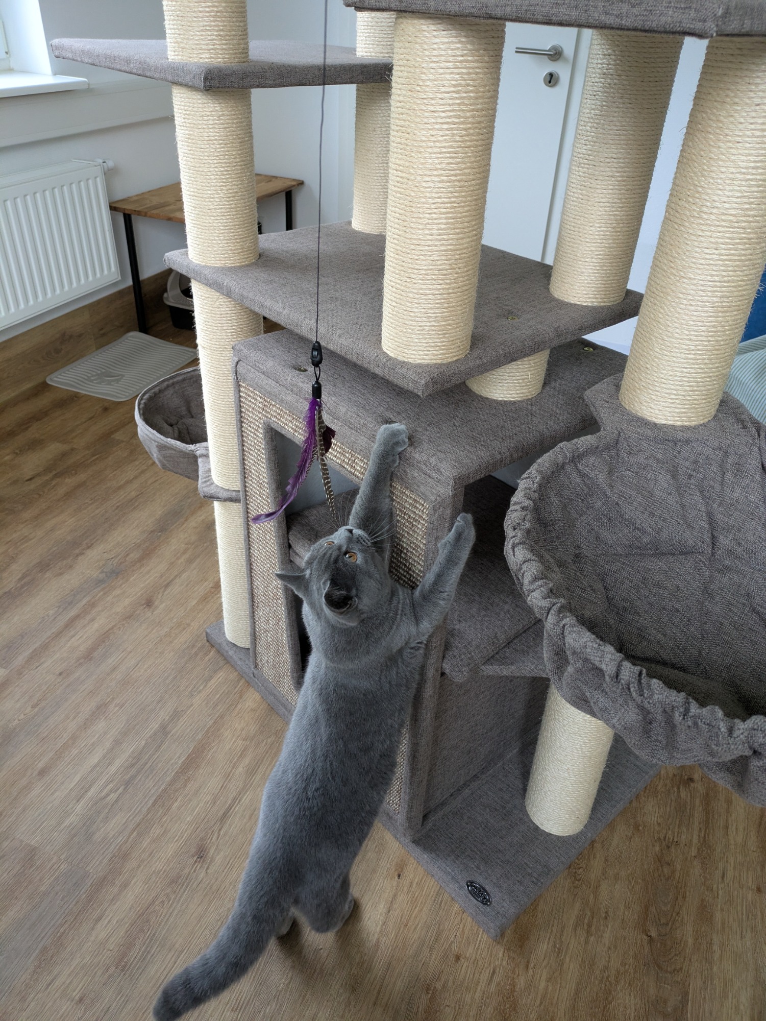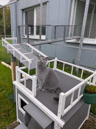 Ausstattung: Doppeltes Tageslichtfenster, Kratzbaum mit unterschiedlichen Ebenen sowie Liege- und Versteckmöglichkeiten, Catwalk zum erhöhten Liegeplatz, Heizungsliege, offene und geschlossene Katzentoilette, Wahl zwischen Trinknapf oder Wasserbrunnen, diverse Spielzeuge