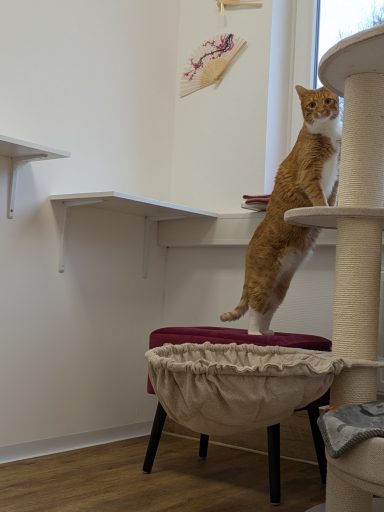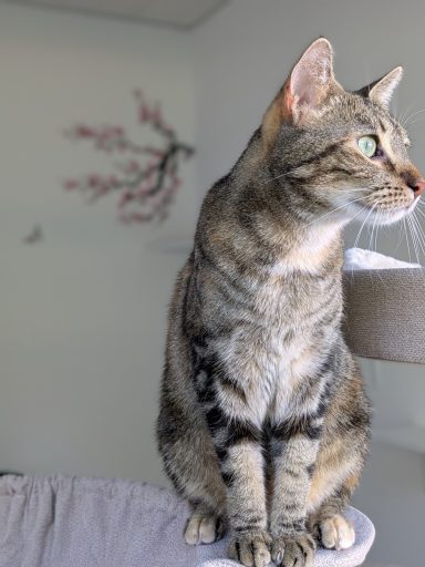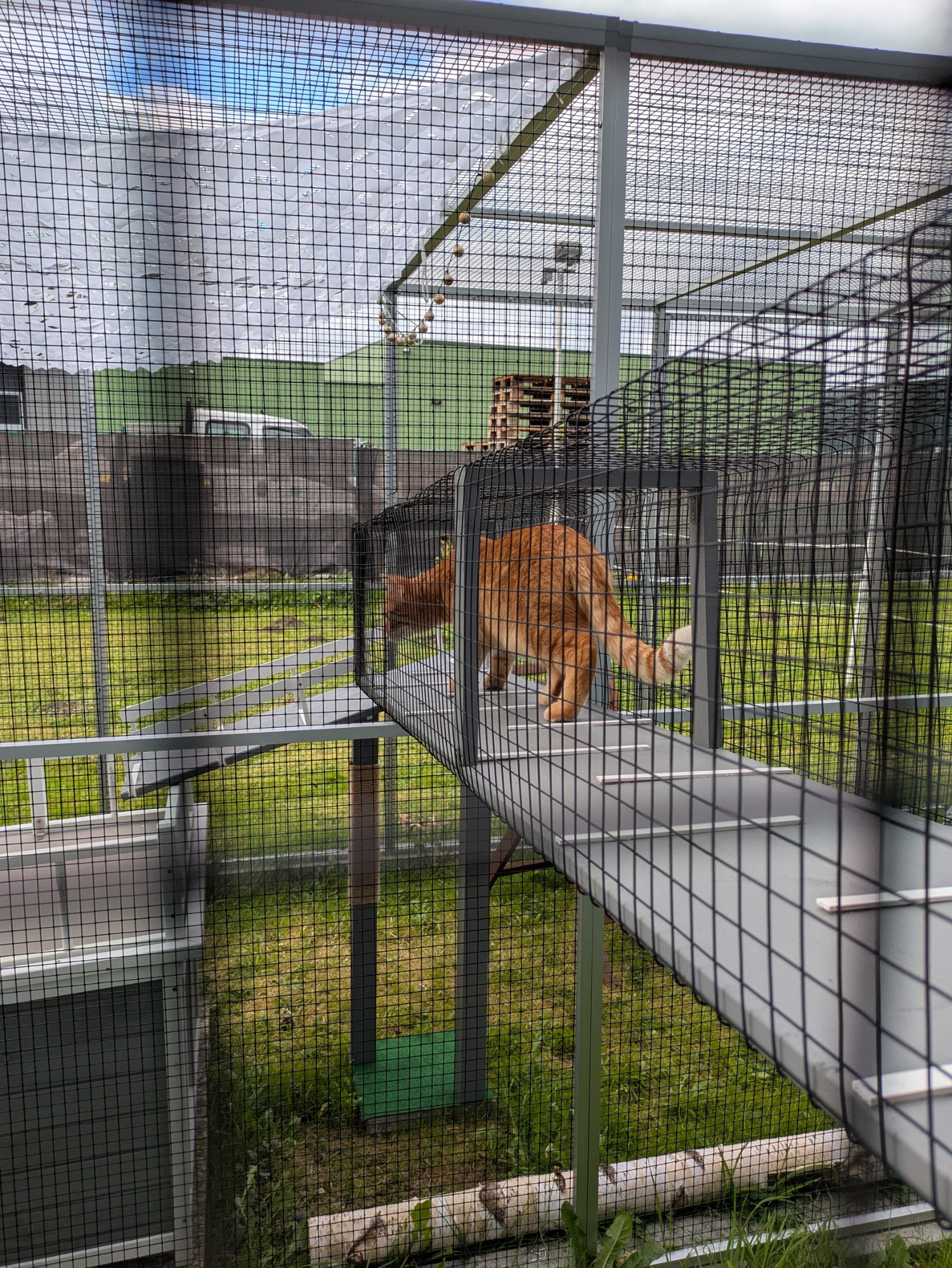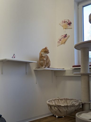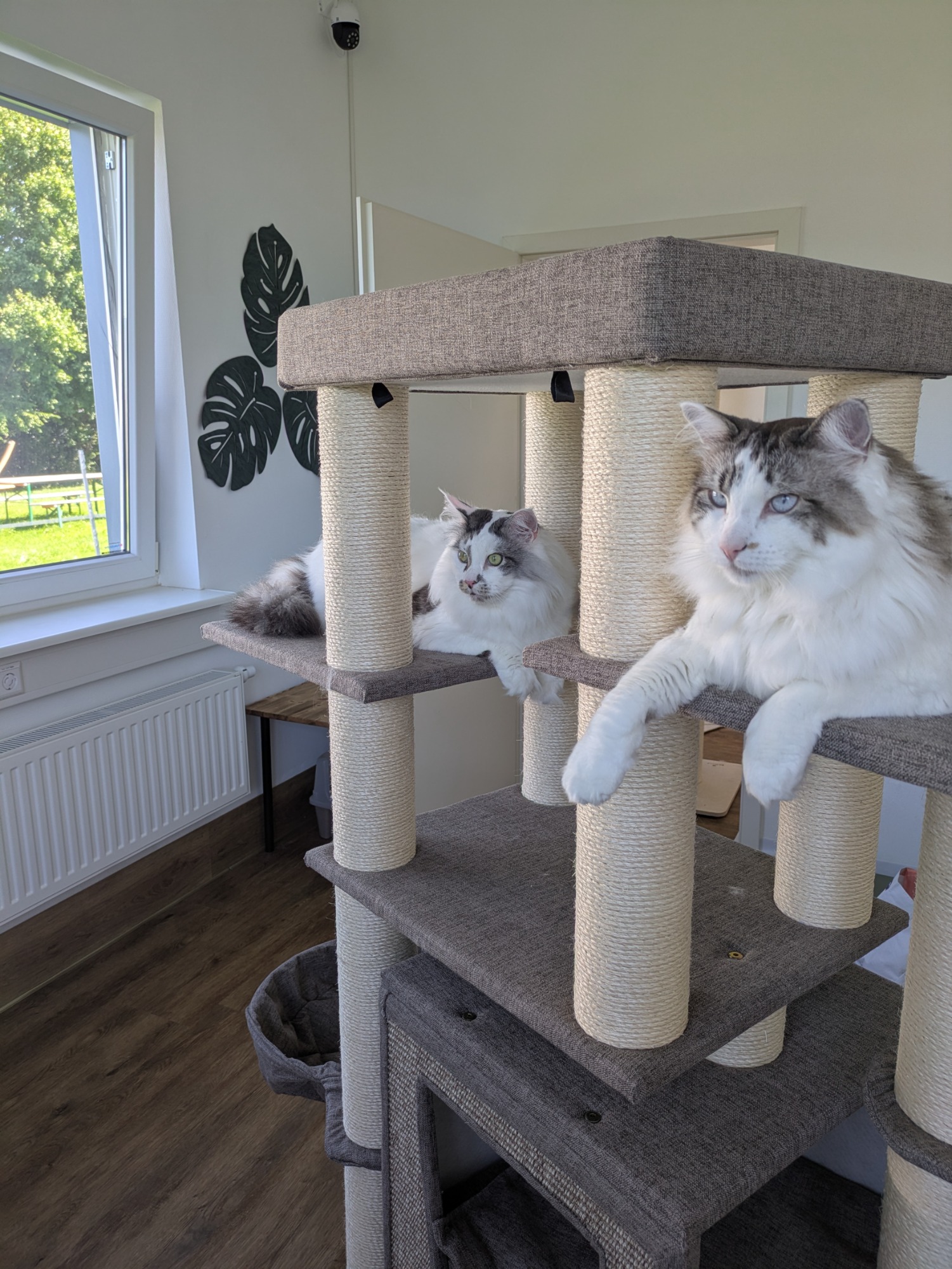 Ausstattung: Doppeltes Tageslichtfenster, zwei Kratzbäume mit unterschiedlichen Ebenen sowie Liege- und Versteckmöglichkeiten, Heizungsliege, Treppe zur Fensterbank, Freigang ins Katzengehege, mehrere Katzentoiletten, Wahl zwischen Trinknapf oder Wasserbrunnen, diverse Spielzeuge